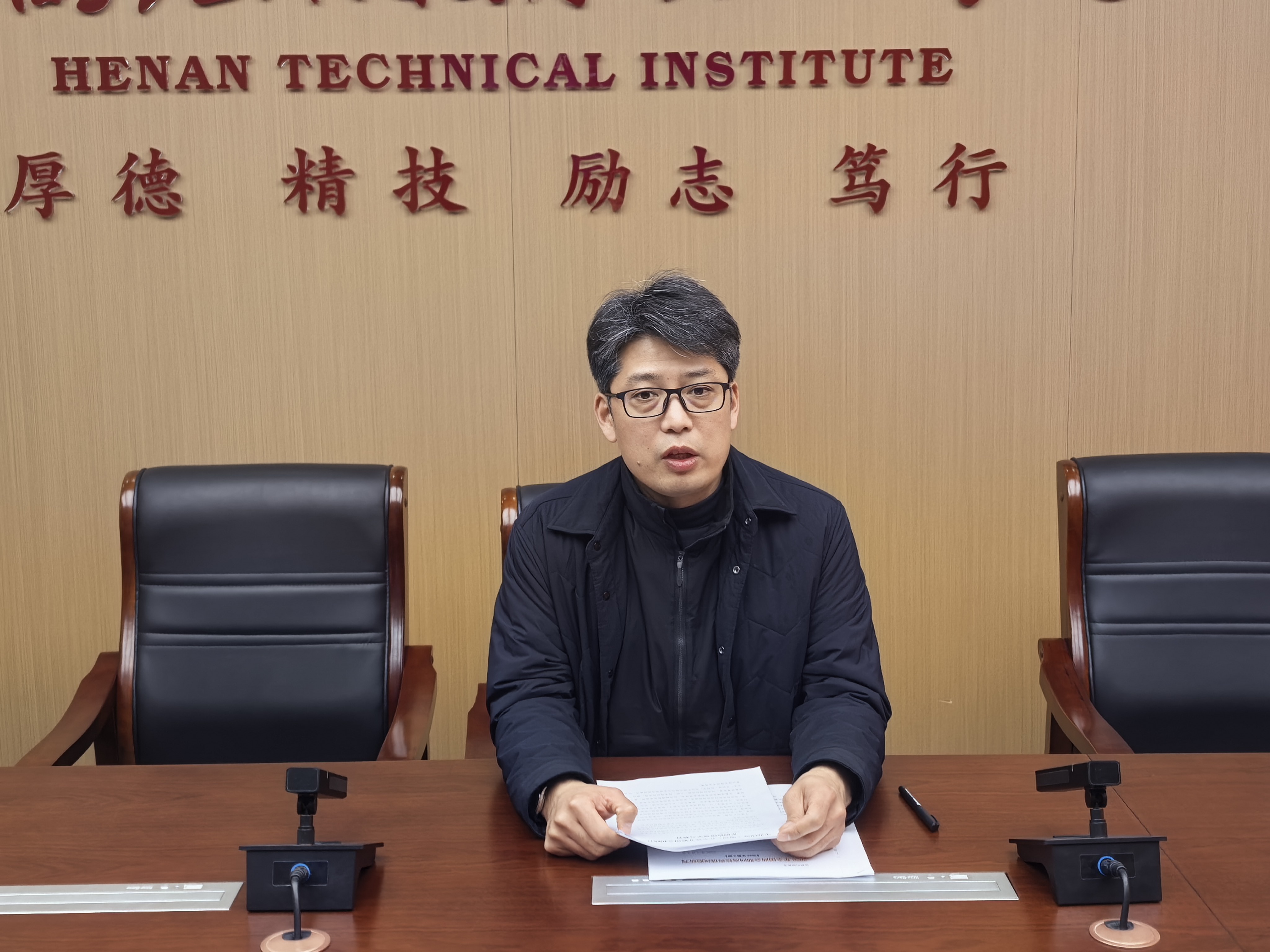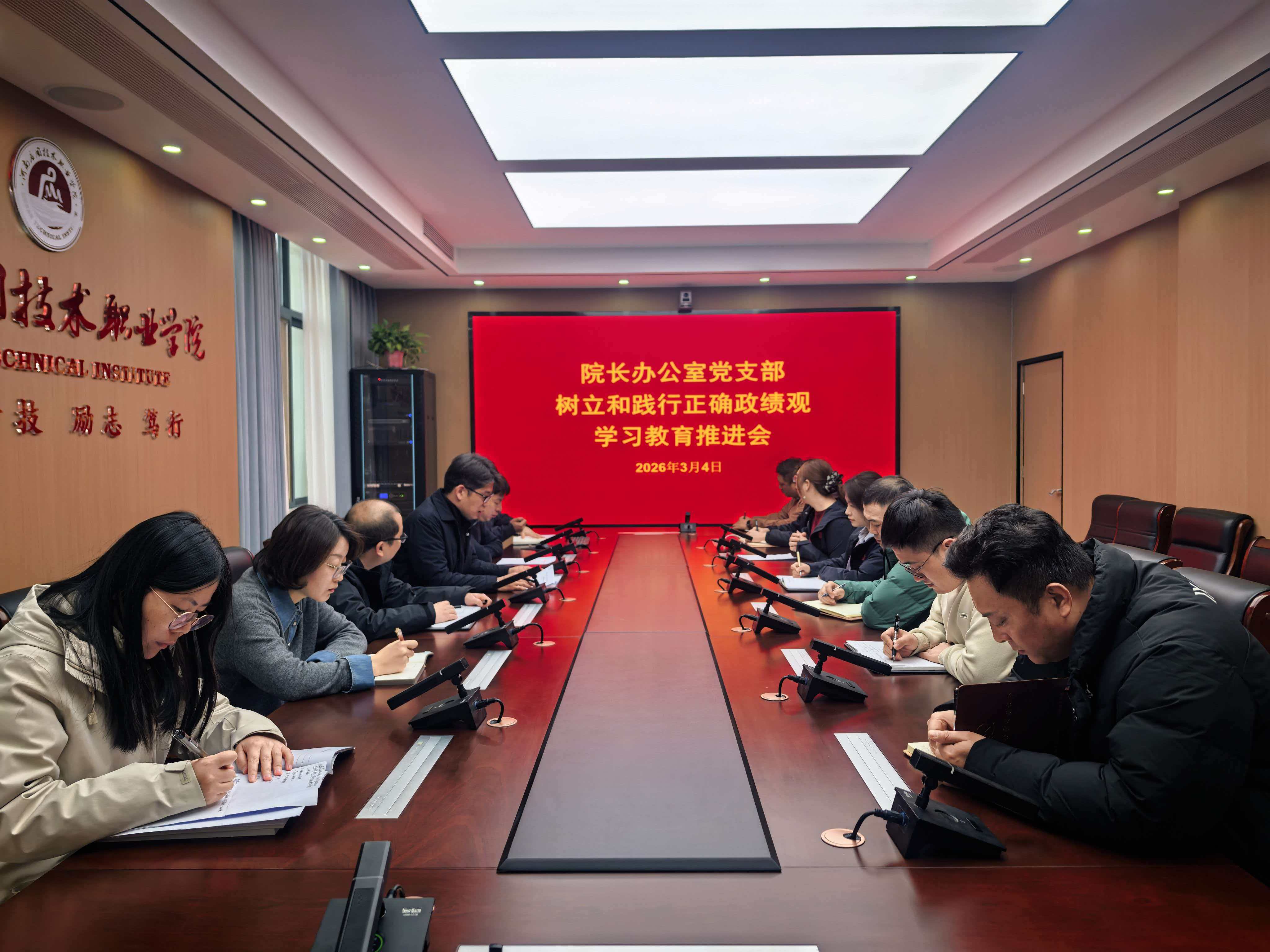 2026年3月4日,河南应用技术职业学院院长办公室党支部在315会议室召开树立和践行正确政绩观学习教育推进会,党支部全体党员参加会议,党支部书记张凡主持会议。